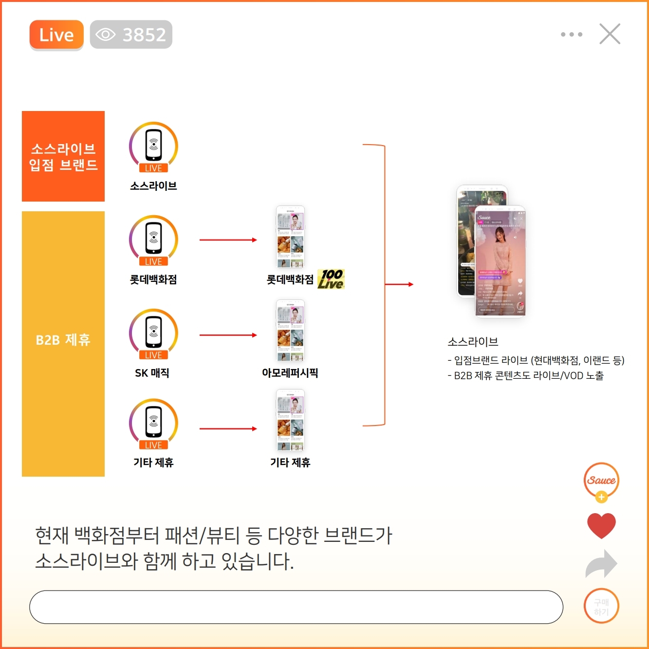 소스라이브는 라이브로 보고 소통하면서 상품을 구매할 수 있는 라이브커머스 플랫폼입니다.