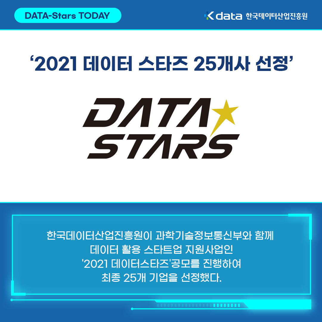 한국데이터산업진흥원(원장 민기영)은 2021 DATA-Stars(데이터 활용 사업화 지원) 공모를 통해 데이터 활용 스타트업 25개 기업을 선정했다고 밝혔다. DATA-Stars(데이터스타즈)는 데이터 활용 스타트업