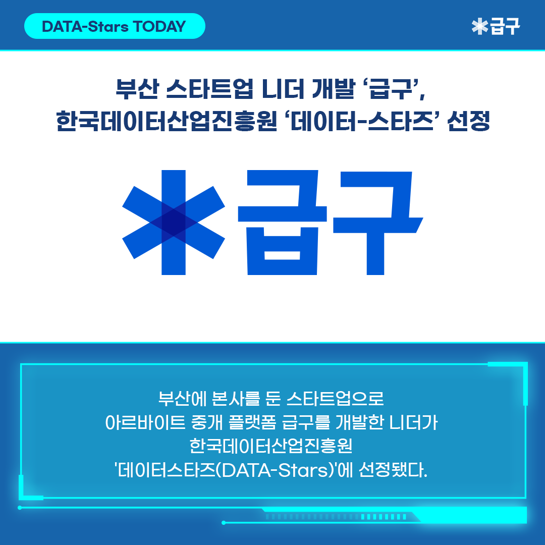 부산에 본사를 둔 스타트업으로 아르바이트 중개 플랫폼 급구를 개발한 니더가 한국데이터산업진흥원 ‘데이터스타즈(DATA-Stars)’에 선정됐다,한국데이터산업진흥원은 데이터활용사업화지원