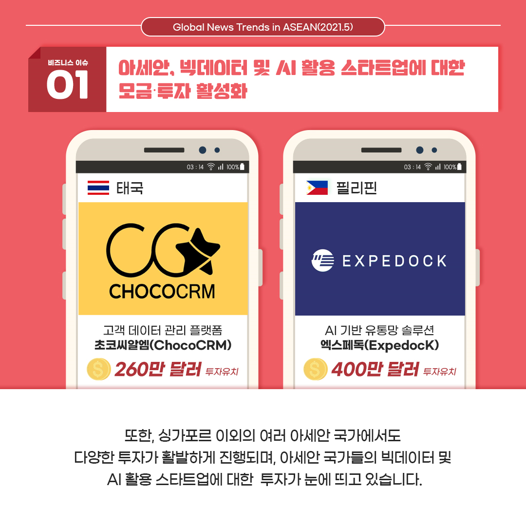 첫 번째 이슈는 '아세안, 빅데이터 및 AI 활용 스타트업에 대한 모금·투자 활성화' 입니다!