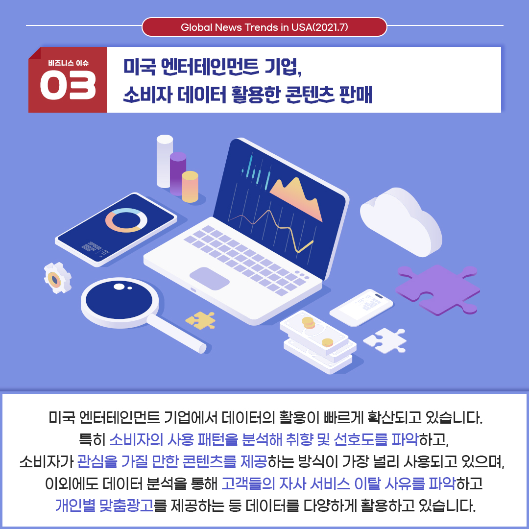 세 번째 이슈는 '미국 엔터테인먼트 기업, 소비자 데이터 활용한 콘텐츠 판매' 입니다.