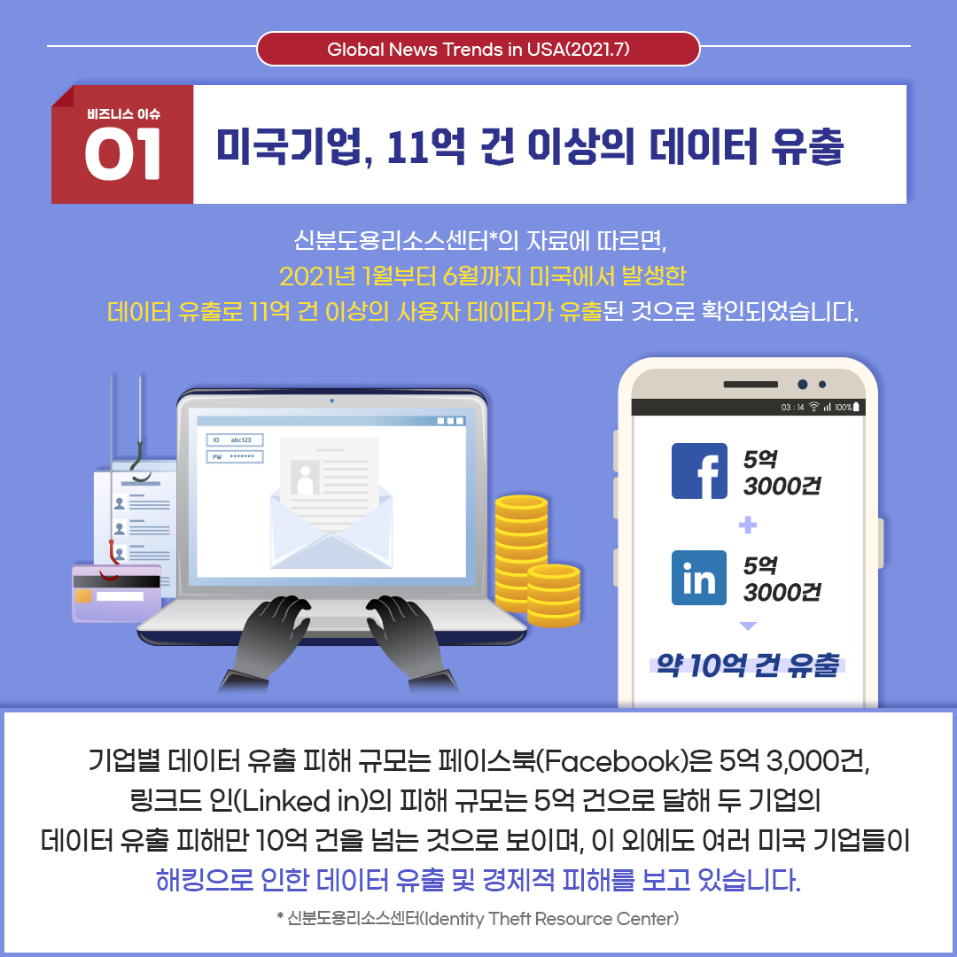 첫 번째 이슈는 '미국기업, 11억 건 이상의 데이터 유출' 입니다.