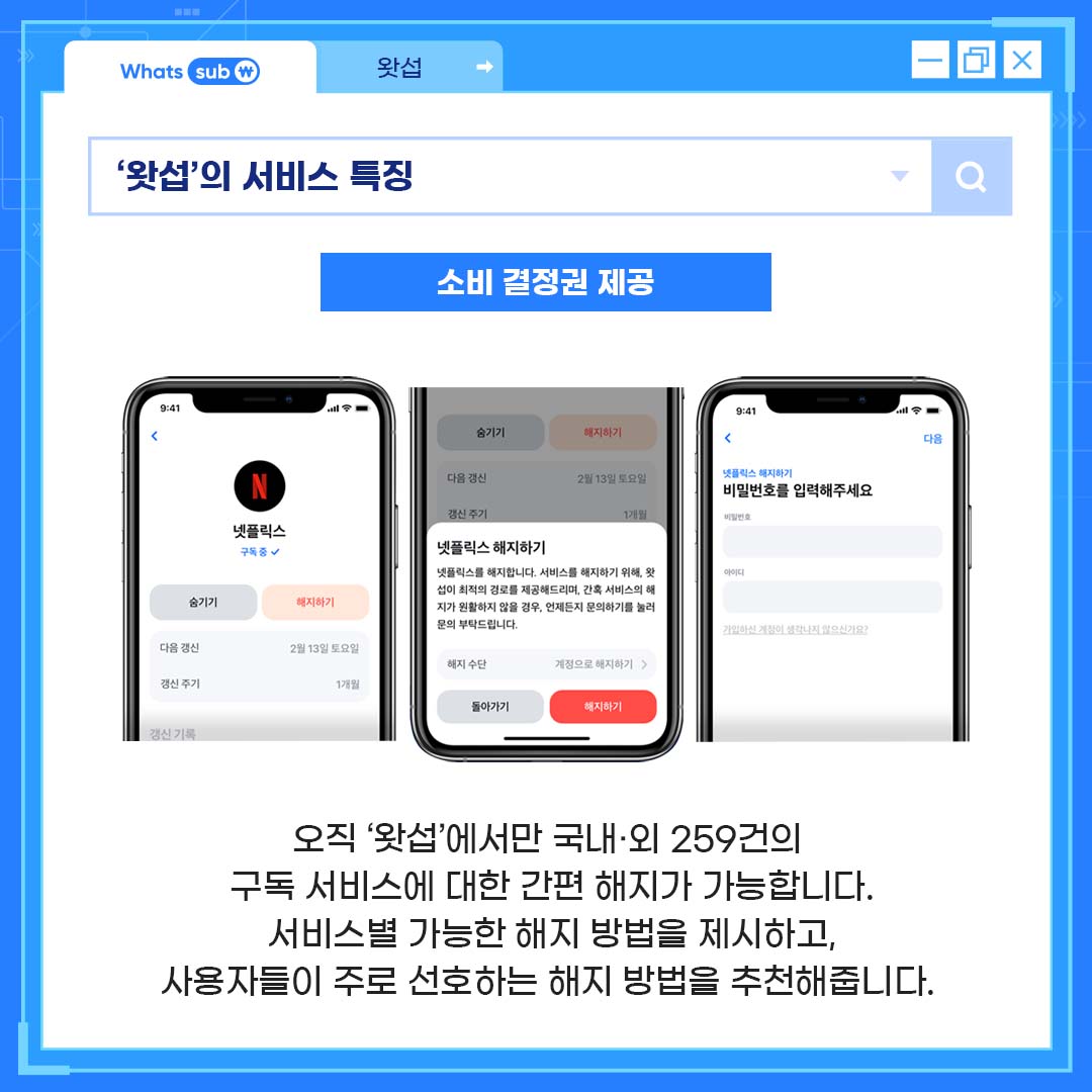 국내,외 259건의 구독 서비스에 대한 간편 해지가 가능합니다.