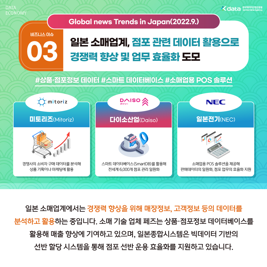 일본 소매업계에서는 경쟁력 향상을 위해 매장정보, 고객정보 등의 데이터를 분석‧활용하는 중입니다.