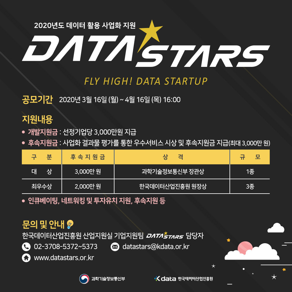 | [2020 DATA-Stars] 데이터 활용 사업화 지원 공모 공고 (3) | 2020.05.03 |